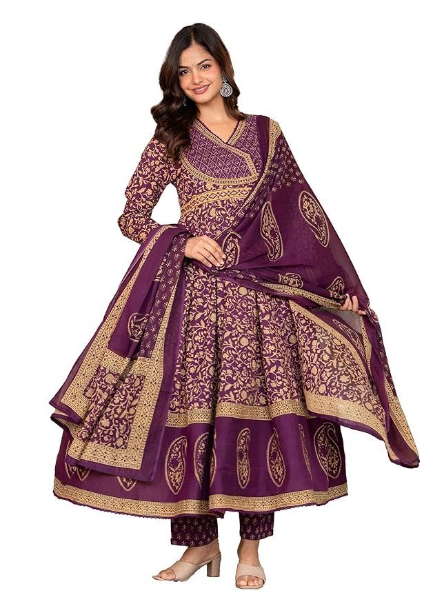 Pistaa’s Women’s Pure Cotton Anarkali Floral Printed Hand Work Kurta with Pant & Dupatta Set